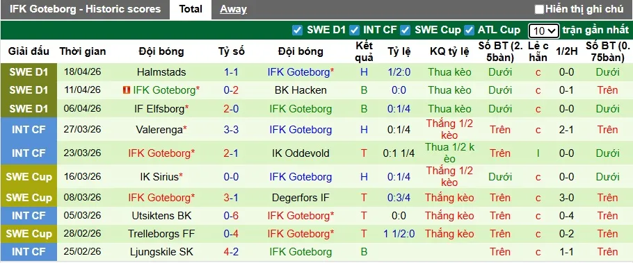 Thống kê phong độ 10 trận đấu gần nhất của Goteborg