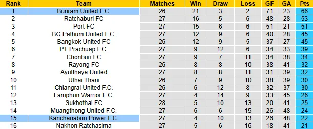 Trái ngược với niềm vui của đội khách, Kanchanaburi Power đang đứng ở vị trí thứ 15 (áp chót) trên BXH với vỏn vẹn 22 điểm. Khoảng cách 4 điểm so với nhóm an toàn là không dễ để Kanchanaburi san lấp khi giải đấu chỉ còn 3 vòng.