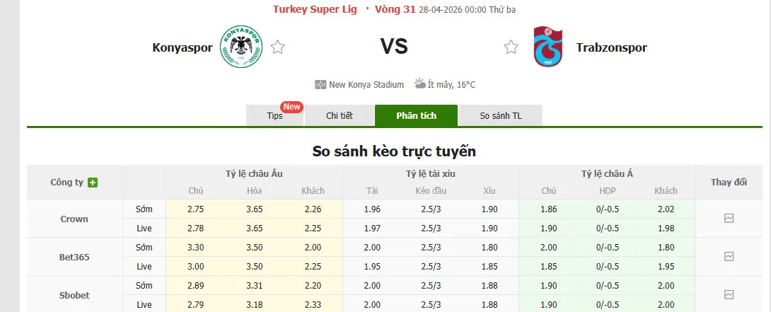 Nhận định soi kèo Konyaspor vs Trabzonspor, 00h00 ngày 28/4 tại VĐQG Thổ Nhĩ Kỳ. Phân tích tỷ lệ kèo, dự đoán kết quả Konyaspor đấu với Trabzonspor từ tỷ lệ châu Âu, châu Á qua các chuyên gia hàng đầu.