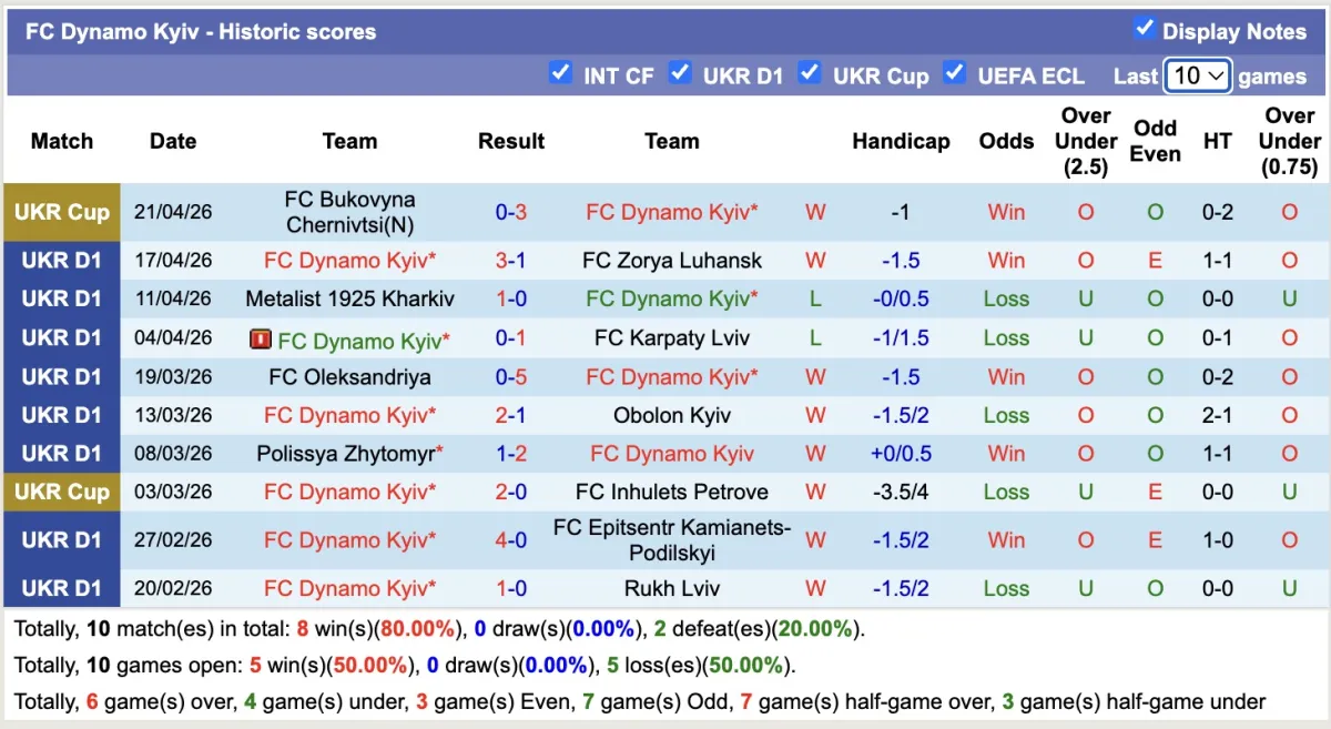 -Thống kê phong độ 10 trận đấu gần nhất của Dynamo Kyiv