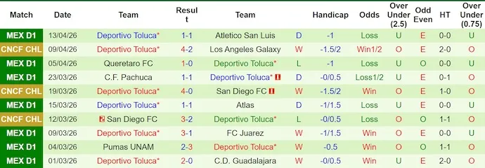 Toluca lại thể hiện sự ổn định hơn trong cùng giai đoạn. Đội bóng Mexico thắng 5, hòa 3 và chỉ thua 2 trong 10 trận gần đây. Dù thành tích sân khách chưa thật sự nổi bật với 1 thắng, 1 hòa và 2 thua, Toluca vẫn cho thấy khả năng phản công rất nguy hiểm mỗi khi đối thủ dâng cao.