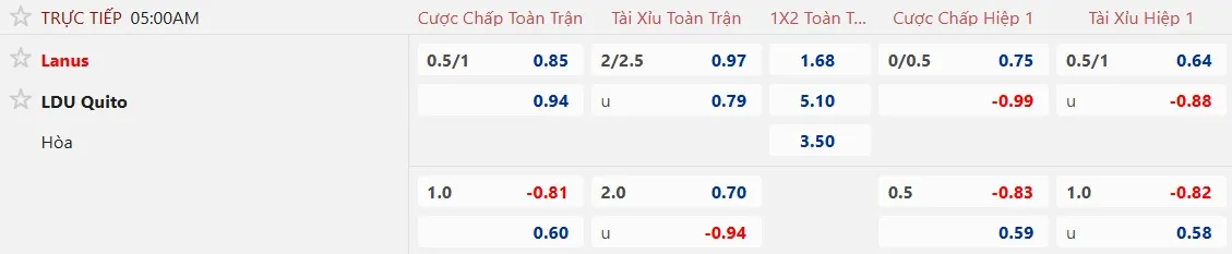 Sàn giao dịch châu Á ghi nhận mức kèo Lanus chấp 3/4 trái, cao nhất trong lịch sử đối đầu, bất chấp việc màn thể hiện của đội chủ nhà gần đây là không thực sự tốt. Điều này cho thấy các nhà đầu tư đang có niềm tin rất lớn dành cho Lanus, đội đã toàn thắng kèo châu Á 2 trận gặp LDU Quito gần nhất.
