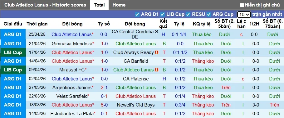 Thống kê phong độ 10 trận đấu gần nhất của Lanus