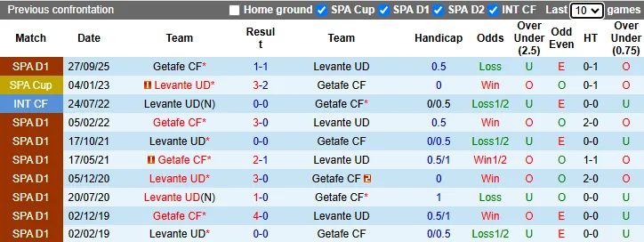 Thống kê phong độ, lịch sử đối đầu Levante vs Getafe