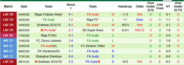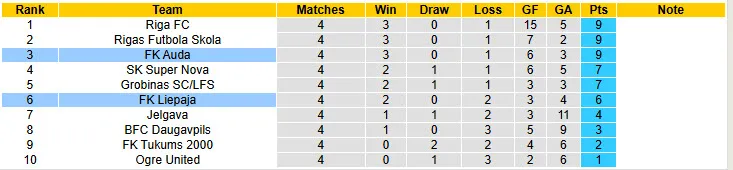 Liepaja không thắng tới 5 trong số 8 trận đấu vừa rồi đụng độ Auda tại mọi đấu trường. Liepaja để thua 2/3 trận đấu mới đây tại giải VĐQG. Auda thắng 3 và chỉ hòa 1 lần ở 4 trận sân khách chính thức gần nhất và là lựa chọn an toàn.