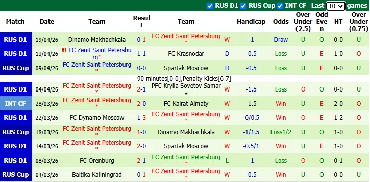 Thống kê phong độ 10 trận gần nhất của Zenit