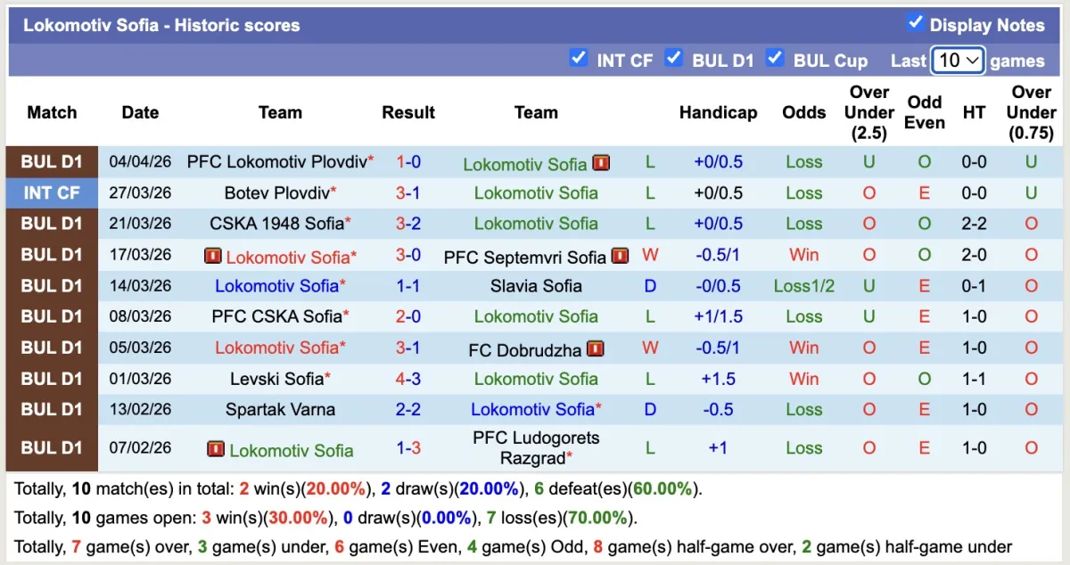 -Thống kê phong độ 10 trận đấu gần nhất của Lokomotiv Sofia