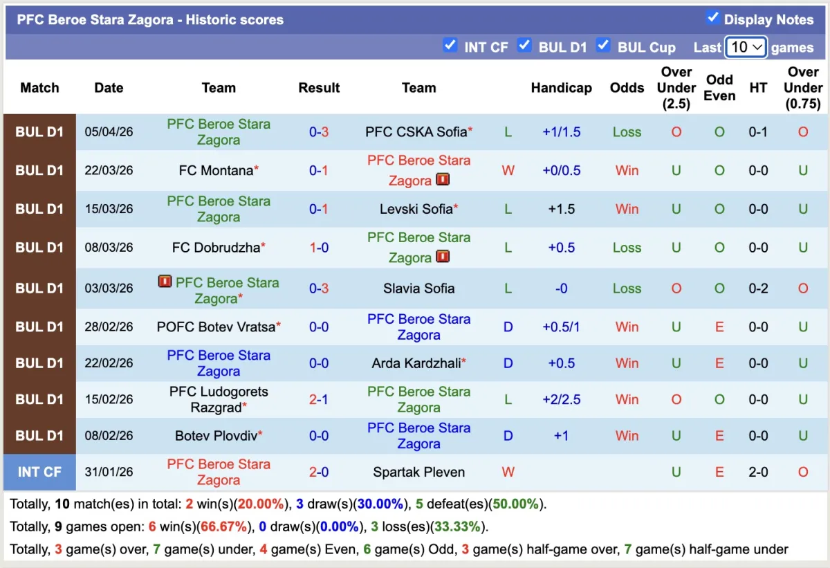 -Thống kê phong độ 10 trận đấu gần nhất của PFC Beroe Stara Zagora