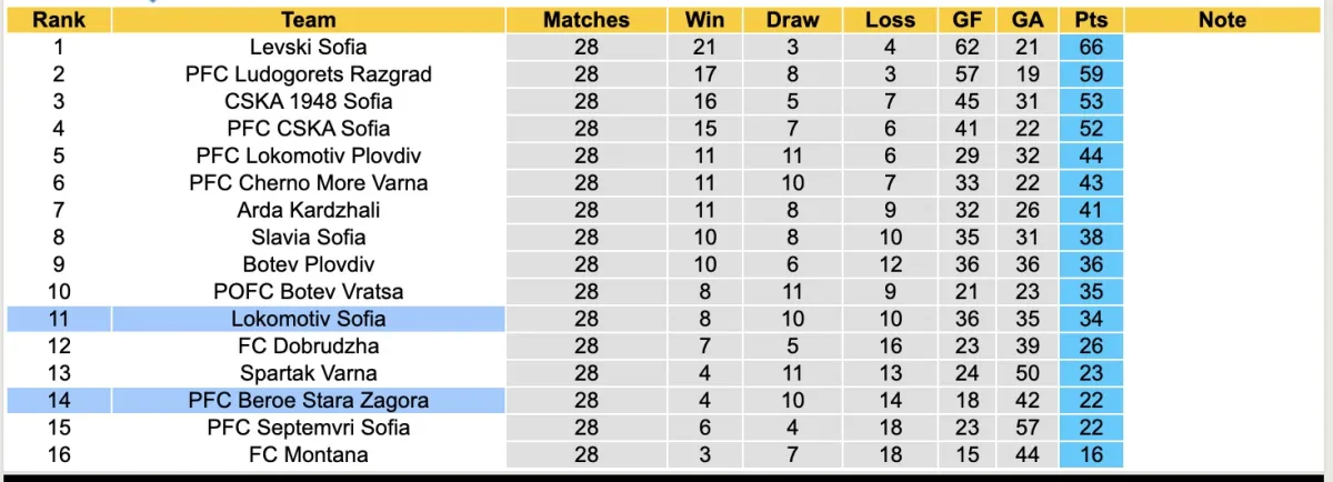 Bảng xếp hạng bóng đá Giải VĐQG Bulgaria 2026