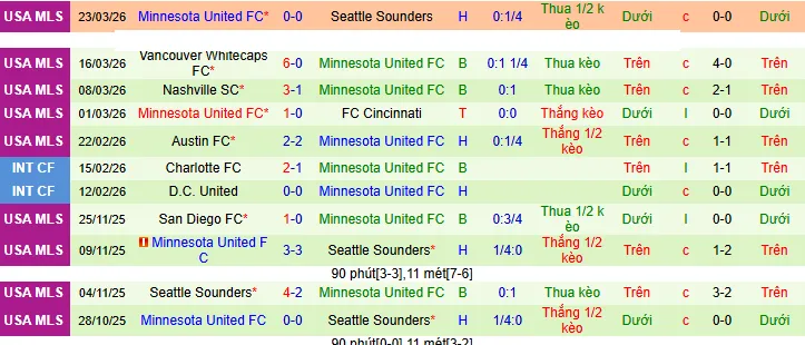 + Minnesota thua 5 thắng 1 trong 6 trận MLS mới nhất trên sân khách theo kèo châu Á.