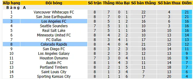 Colorado (4 thắng – 4 thua – 0 hòa, hạng tám) đã ghi được 21 bàn thắng ở MLS 2026, nhiều thứ hai ở khu vực phía Tây, trong khi để thủng lưới 15 bàn, với hiệu số bàn thắng bại là +6 (tốt thứ năm bảng miền Tây).