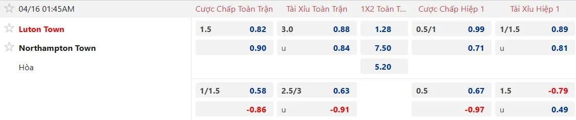 Sàn giao dịch châu Á ghi nhận mức kèo Luton Town chấp 1 1/2 trái, cao nhất trong lịch sử đối đầu giữa hai đội. Điều này cho thấy các nhà đầu tư đang có niềm tin rất lớn dành cho đội chủ nhà, những người thắng kèo 5 và hòa 2 ở 7 trận vừa qua. Với Northampton, đội khách thua kèo châu Á 8, hòa 1 và chỉ thắng 2 ở 11 trận vừa qua.