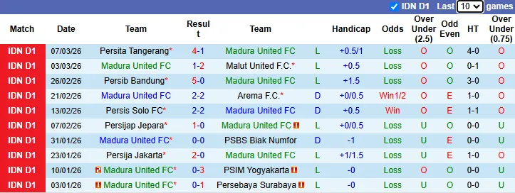 Thống kê phong độ 10 trận gần nhất của Madura United