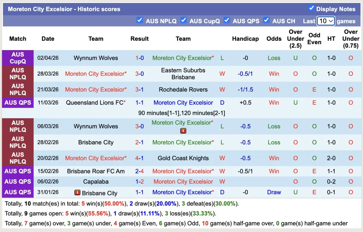 -Thống kê phong độ 10 trận đấu gần nhất của Moreton City Excelsior