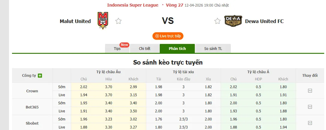 Nhận định soi kèo Malut United vs Dewa United, 19h00 ngày 12/4 tại VĐQG Indonesia. Phân tích tỷ lệ kèo, dự đoán kết quả Malut United đấu với Dewa United từ tỷ lệ châu Âu, châu Á qua các chuyên gia hàng đầu.