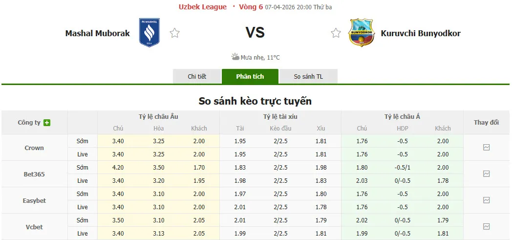 Nhận định soi kèo Mashal Muborak vs Bunyodkor, 20h00 ngày 7/4 tại VĐQG Uzbekistan. Phân tích tỷ lệ kèo, dự đoán kết quả Mashal Muborak đấu với Bunyodkor từ tỷ lệ châu Âu, châu Á qua các chuyên gia hàng đầu.