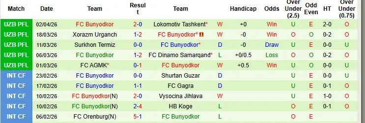 Thống kê phong độ 10 trận đấu gần nhất của Bunyodkor