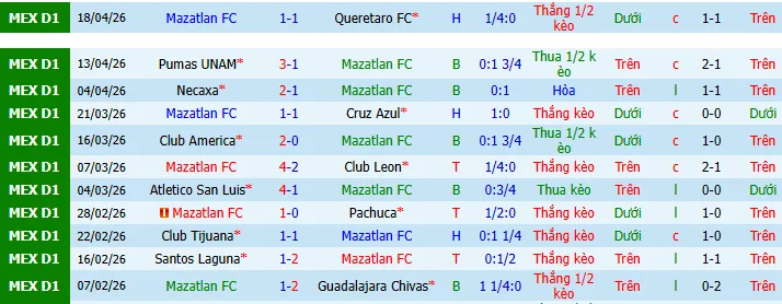 + Mazatlan thắng 3 thua 4 hòa 3 trong 10 trận gần đây ở giải VĐQG.