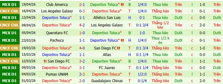 + Toluca thua 4 thắng 1 trong 5 trận mới nhất trên sân khách theo kèo châu Á.