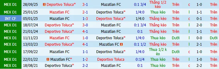 + Mazatlan thắng 2 hòa 2 thua 6 trong 10 trận gần nhất đối đầu với Toluca.