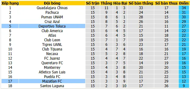 Ngược lại hoàn toàn, Deportivo Toluca đã thể hiện phong độ đáng khen ngợi mùa này, hiện đang vững vàng ở vị trí thứ 5 với tổng cộng 27 điểm. Thành tích tổng thể 7 chiến thắng, 6 trận hòa và chỉ 2 trận thua cho thấy tinh thần cạnh tranh của họ tại giải đấu. Với 21 bàn thắng và chỉ để thủng lưới 11 bàn, Toluca sở hữu một trong những hàng phòng ngự tốt nhất giải đấu, thể hiện hiệu quả của chiến thuật dưới sự dẫn dắt của HLV Antonio Mohamed.