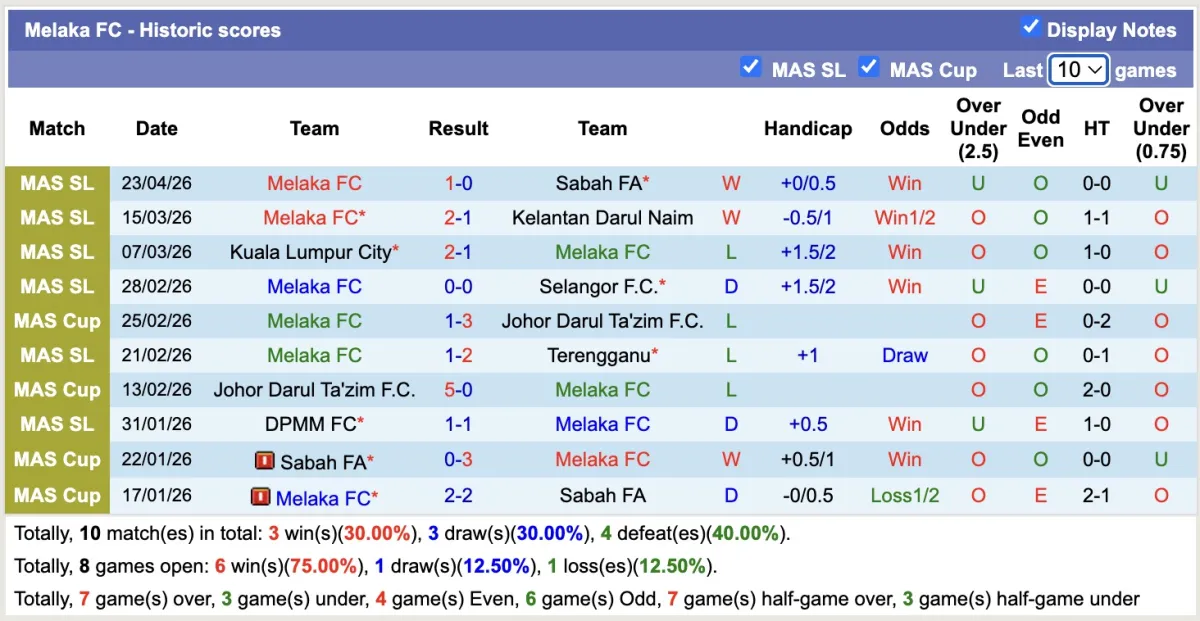 -Thống kê phong độ 10 trận đấu gần nhất của Melaka