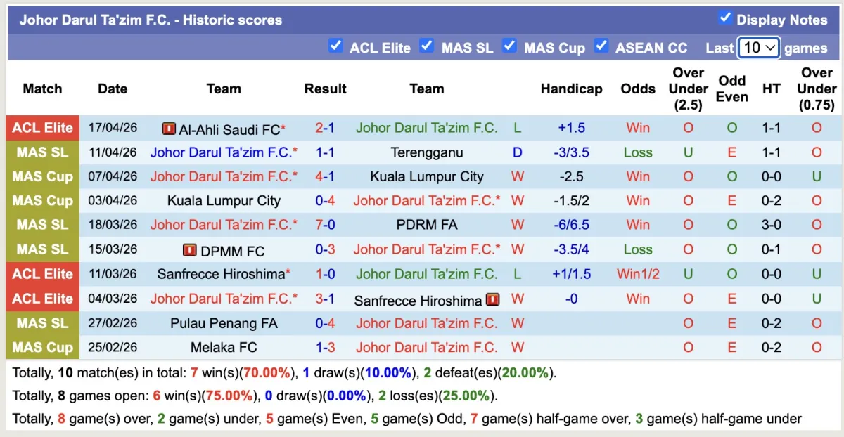 -Thống kê phong độ 10 trận đấu gần nhất của Johor Darul Ta'zim