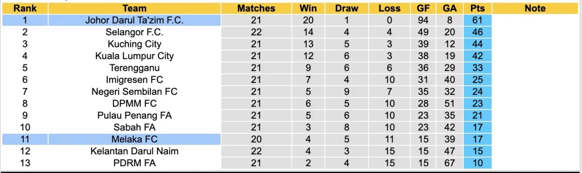 Ở giải VĐQG mùa giải năm nay Johor Darul Ta'zim đang trình diễn một lối đá thăng hoa và đầy chắc chắn. 21 trận đấu đã qua đội bóng này đang bất bại và có 20 chiến thắng, ghi 94 bàn và chỉ lọt lưới 8 lần. Với những con số này, không bất ngờ khi Melaka nếm trái đắng.