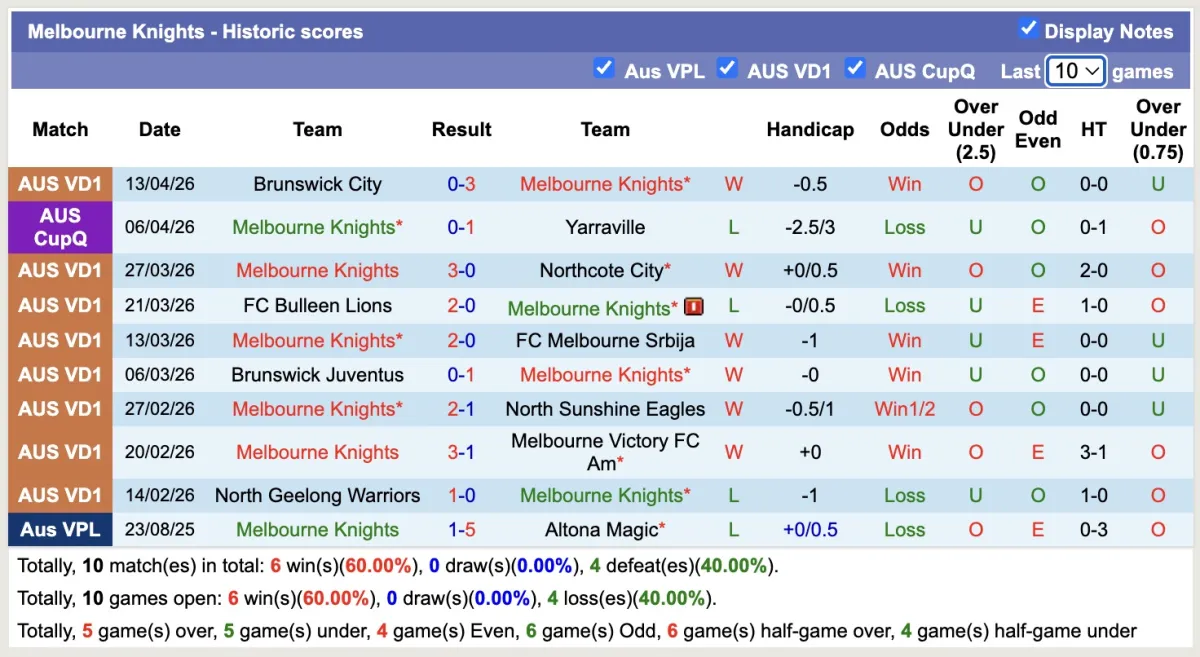 -Thống kê phong độ 10 trận đấu gần nhất của Melbourne Knights