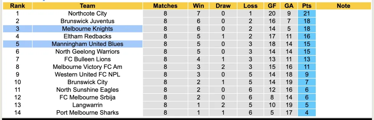 Tuy vậy có lẽ Melbourne Knights đang rất cố gắng để có thể trở lại mái nhà NPL Victoria khi 8 vòng đấu đã qua đội chủ nhà chỉ nếm 2 thất bại và giành đến 6 chiến thắng. Với 18 điểm có được họ đang đứng thứ 3 trên bảng xếp hạng.