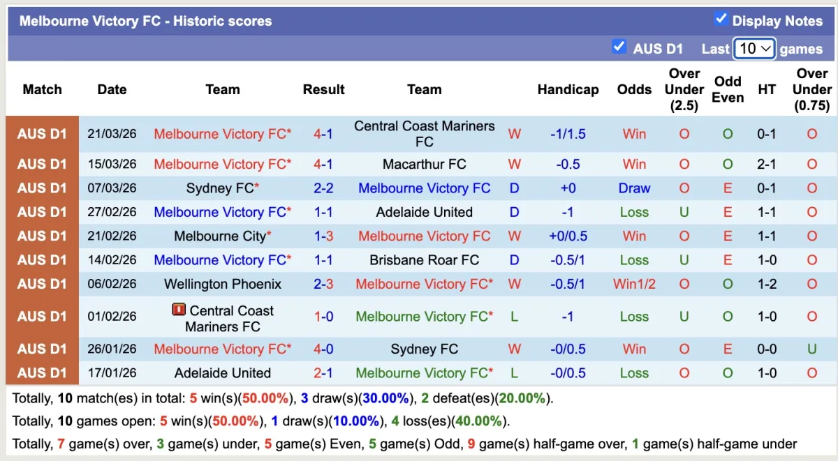 -Thống kê phong độ 10 trận đấu gần nhất của Melbourne Victory