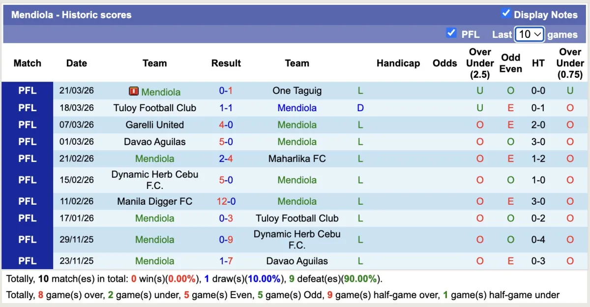 4 lần đối đầu gần nhất giữa Mendiola và Stallion Laguna đều diễn ra với tưng bừng bàn thắng và cùng chung một kịch bản đội chủ nhà chịu trận khi mỗi trận đấu đội bóng này nhận từ 5 đến 8 bàn thua. Nhiều khả năng đây sẽ là trận đấu đội khách tưng bừng bắn phá.