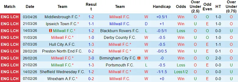 – Thống kê kết quả 10 trận gần nhất của Millwall