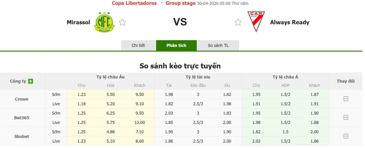 Mirassol là địa chỉ thiếu tin cậy khi thua kèo tới 12 lần và chỉ thắng kèo có 3 lần ở 16 trận đấu mới đây tại mọi đấu trường. Club Always Ready thắng kèo 2/3 trận đấu mới đây và trong đó có 1 trận đấu tại Copa Libertadores.