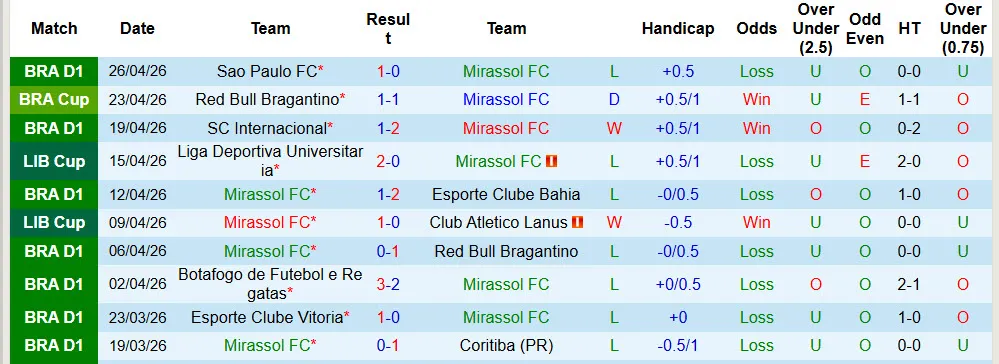 Thống kê phong độ 10 trận đấu gần nhất của Mirassol