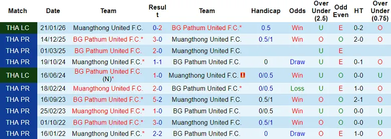 Muangthong United bất bại toàn bộ 11 lần tiếp đón BG Pathum United thuộc khuôn khổ Thai League kể từ tháng 9/2009. Có tới 11 trong số ấy chứng kiến Muangthong United có được niềm vui trọn vẹn.