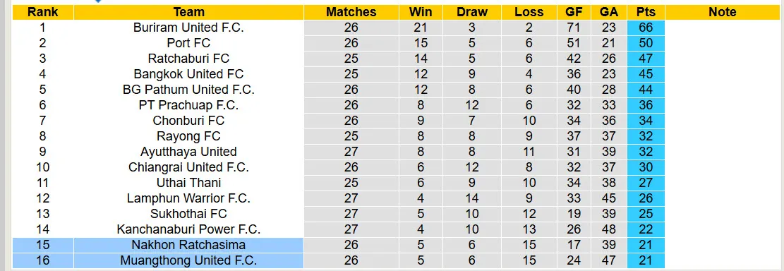 Muangthong United và Nakhon Ratchasima được xem là trận đấu tâm điểm của vòng 20 giải VĐQG Thái Lan khi họ đang là hai đội bóng đứng cuối cùng trên BXH. Chính xác, họ cùng có được 21 điểm sau 20 trận và được xem là những ứng viên nặng ký cho ba suất xuống hạng. Trở lại với trận đấu muộn vòng 20, Muangthong United và Nakhon Ratchasima tự hiểu họ bằng mọi giá phải thắng ở trận đối đầu trực tiếp mới có thể nuôi hy vọng trụ hạng. Nhắc lại, họ thực tế chỉ kém đội an toàn khoảng cách 4 điểm và đang đá ít hơn 1 trận. Với cục diện hiện tại, 3 điểm ở trận đấu đêm nay sẽ mở toang cánh cửa trụ hạng.