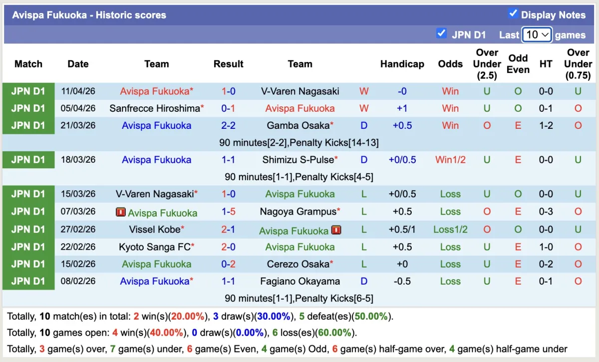 -Thống kê phong độ 10 trận đấu gần nhất của Avispa Fukuoka