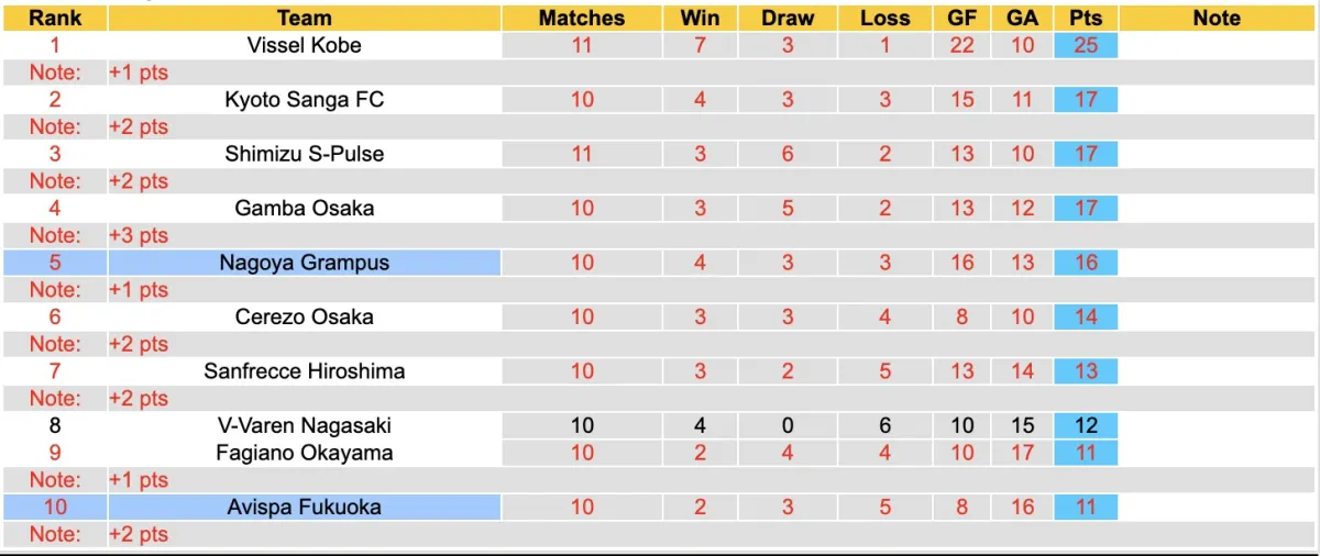 -Thống kê phong độ 10 trận đấu gần nhất của Nagoya Grampus