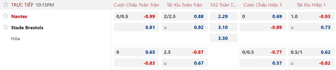 Sàn giao dịch châu á ghi nhận mức kèo Nantes chấp 1/4 trái, tỷ lệ ở trận đối đầu gần nhất xuất hiện chứng kiến họ nhận thất bại ngay trên sân nhà trước Brest. Với thành tích thua kèo châu Á 3/4 trận gần đây, Nantes đang gặp tương đối nhiều khó khăn trước Brest.