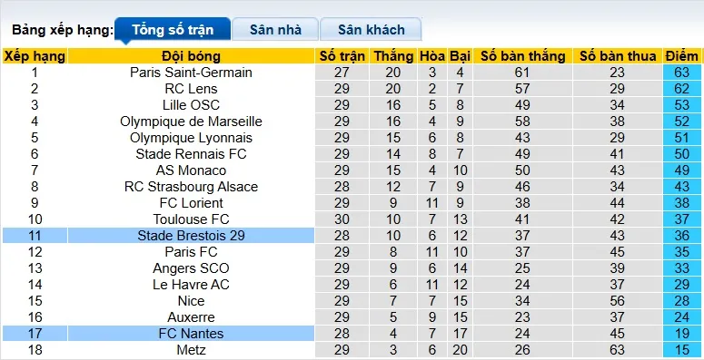 Thống kê phong độ, lịch sử đối đầu của Nantes vs Brest