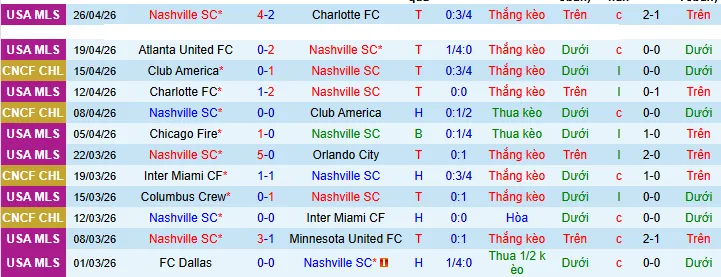 + Nashville thắng 11 kèo châu Á hòa 1 chỉ thua 3 trong 15 trận chính thức năm 2026 ở 2 mặt trận chính MLS và Cúp C1.