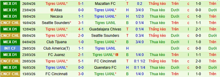 + Tigres UANL thắng 1 thua 3 trong 4 trận vừa qua theo kèo châu Á.