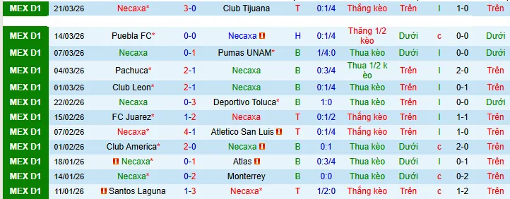 Trong trận đấu gần nhất diễn ra vào ngày 21/3, Necaxa đã đánh bại Tijuana với tỷ số 3-0.