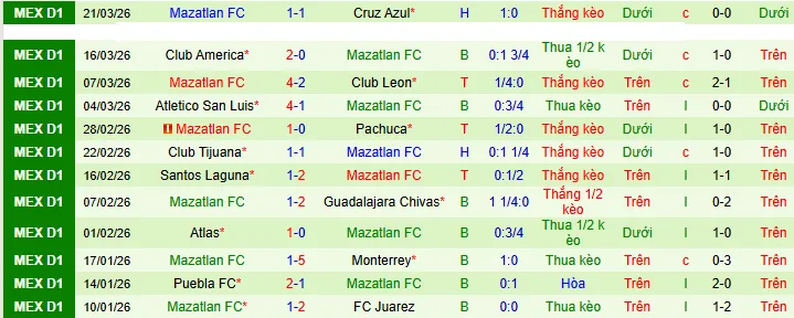 Trong trận đấu gần nhất diễn ra vào ngày 21/3, Mazatlán đã hòa với ông lớn Cruz Azul với tỷ số 1-1.