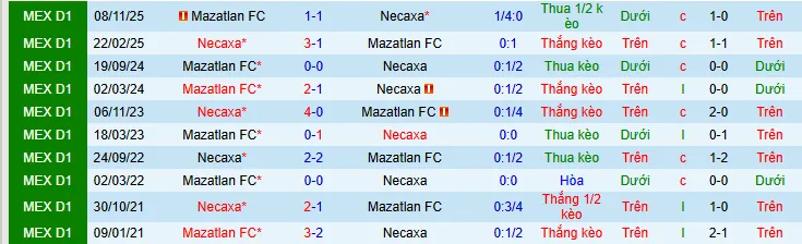 Trong lần đối đầu gần nhất vào ngày 11/8/2025, Necaxa và Mazatlán hòa với tỷ số 1-1.