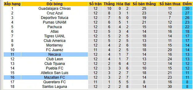 Necaxa hiện đang đứng ở vị trí thứ 11 trên bảng xếp hạng Liga MX với 13 điểm sau 12 vòng đấu, trong khi Mazatlán đứng ở vị trí thứ 16 với 11 điểm sau 12 vòng đấu. Một năm trước, Necaxa đứng thứ 6 trên BXH với 21 điểm, còn Mazatlan đứng thứ 12 với 13 điểm. Nhìn chung cả hai đội đều thụt lùi so với mùa trước.