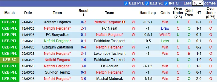Thống kê phong độ 10 trận gần nhất của Neftchi Fergana