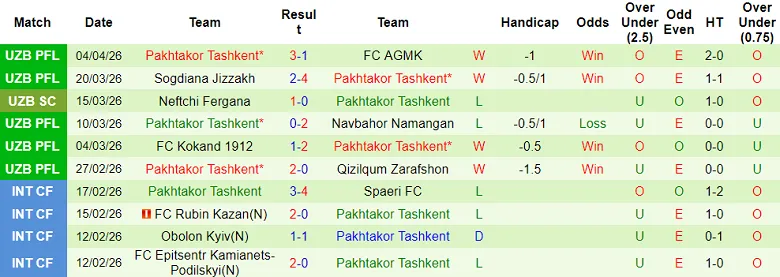 – Thống kê kết quả 10 trận gần nhất của Pakhtakor