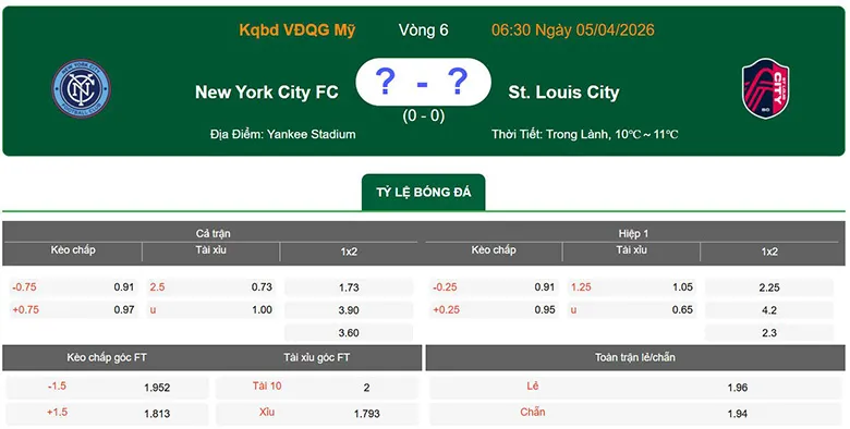 Nhận định, soi kèo New York City vs Saint Louis City, 6h30 ngày 5/4 – Giải vô địch Mỹ MLS. Phân tích tỷ lệ kèo, dự đoán kết quả New York City đấu với Saint Louis City chuẩn xác từ các chuyên gia hàng đầu BongdaNET.
